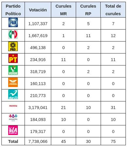 En consecuencia, en plenitud de jurisdicción, la Sala Superior realizó una nueva distribución de escaños de representación para el Congreso del Estado de México, que quedó integrado de la siguiente manera: