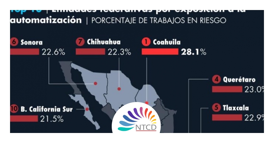 Entre las entidades más afectadas destacan Coahuila y Quintana Roo, donde la proporción de empleos en riesgo es significativamente alta. En Coahuila, cerca del 28% de los puestos laborales podrían ser impactados debido a su fuerte vocación industrial, que se presta a procesos de automatización avanzada. Quintana Roo, con una economía altamente dependiente de sectores como turismo y servicios, también enfrenta riesgos similares.
