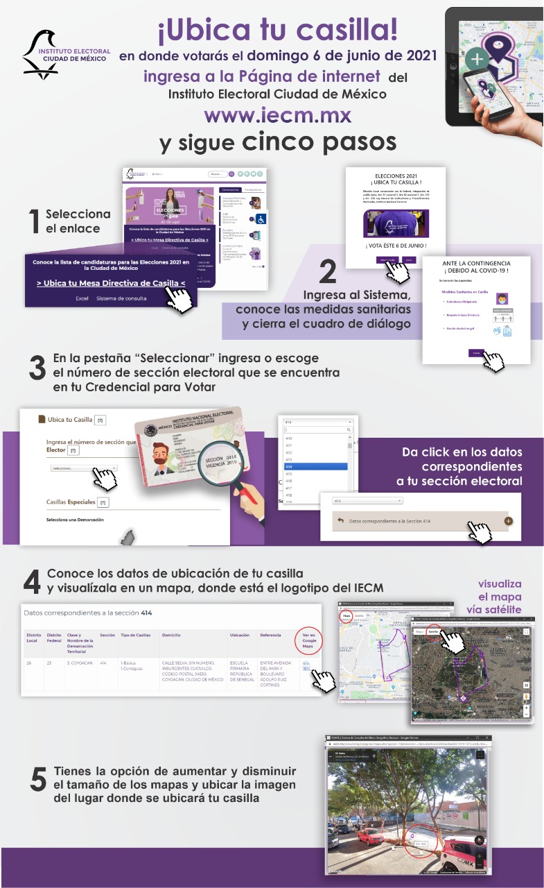 Para ello, las y los capitalinos deberán ingresar en el sitió el número de la sección que viene al frente de su Credencial de Elector y el Sistema les indicará la dirección y ubicación geográfica en Google Maps de la casilla de votación.