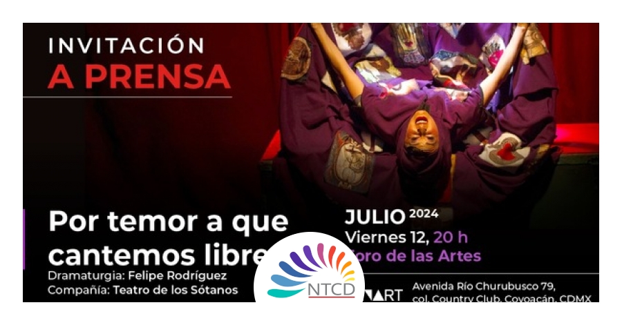 _ La Secretaría de Cultura del Gobierno de México y el Centro Nacional de las Artes invitan a los medios de comunicación a la función especial de la obra teatral "Por el temor a que cantemos libres", escrita por el dramaturgo Felipe Rodríguez e interpretada por la Compañía Teatro de los Sótanos. Este evento se llevará a cabo el viernes 12 de julio de 2024 a las 20:00 horas en el Foro de las Artes, ubicado en Avenida Río Churubusco 79, colonia Country Club, Coyoacán, Ciudad de México.
