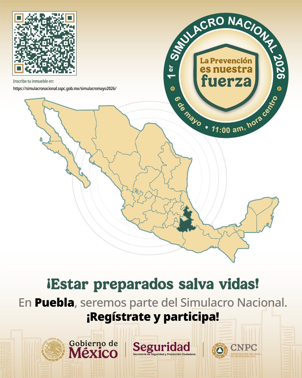 _ El Gobierno de Puebla, a través de la Coordinación General de Protección Civil, invita a la ciudadanía a sumarse al Primer Simulacro Nacional 2026, que se llevará a cabo el próximo 6 de mayo a las 11:00 horas. El objetivo es fortalecer la cultura de la prevención y la capacidad de reacción de la población ante una emergencia.