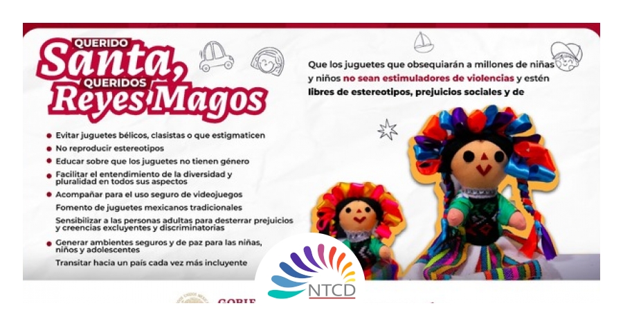 De esta manera, el llamado de la Secretaría de Gobernación, a través de la Comisión Nacional para Prevenir y Erradicar la Violencia contra las Mujeres (Conavim), la SE del Sipinna nacional, el Consejo Nacional para Prevenir la Discriminación (Conapred) y la Comisión para el Diálogo con los Pueblos Indígenas de México (CDPIM), adscritas a la Subsecretaría de Derechos Humanos, Población y Migración, es a: Evitar juguetes bélicos, clasistas o que estigmaticen No reproducir estereotipos Educar sobre que los juguetes no tienen género Facilitar el entendimiento de la diversidad y pluralidad en todos sus aspectos Acompañar para el uso seguro de videojuegos Fomento de juguetes mexicanos tradicionales Sensibilizar a las personas adultas para desterrar prejuicios y creencias excluyentes y discriminatorias Generar ambientes seguros y de paz para las niñas, niños y adolescentes Transitar hacia un país cada vez más incluyente