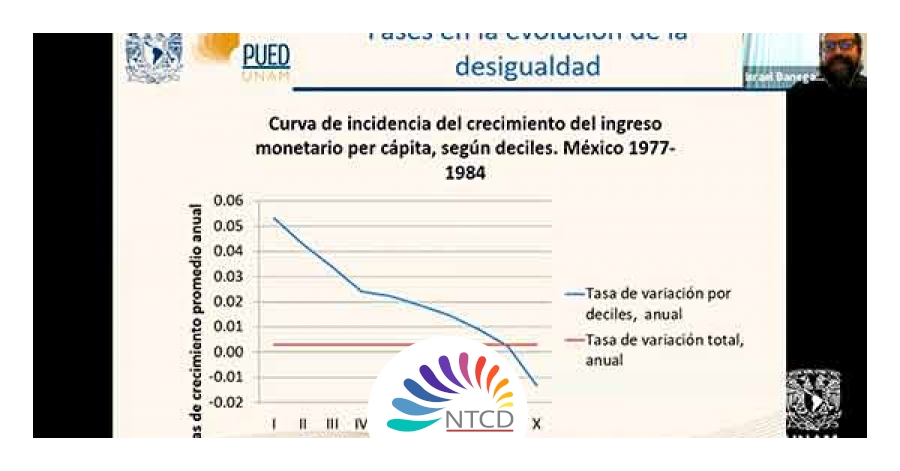Israel Banegas González, también académico del PUED, abordó el desarrollo y desigualdad del ingreso, mediante el cual analizó el fin del modelo estabilizador de 1977 a 1984, el cambio de modelo económico de 1984 a 1998 y de la política social de 1998 a 2014, con una aparente disminución de la desigualdad.