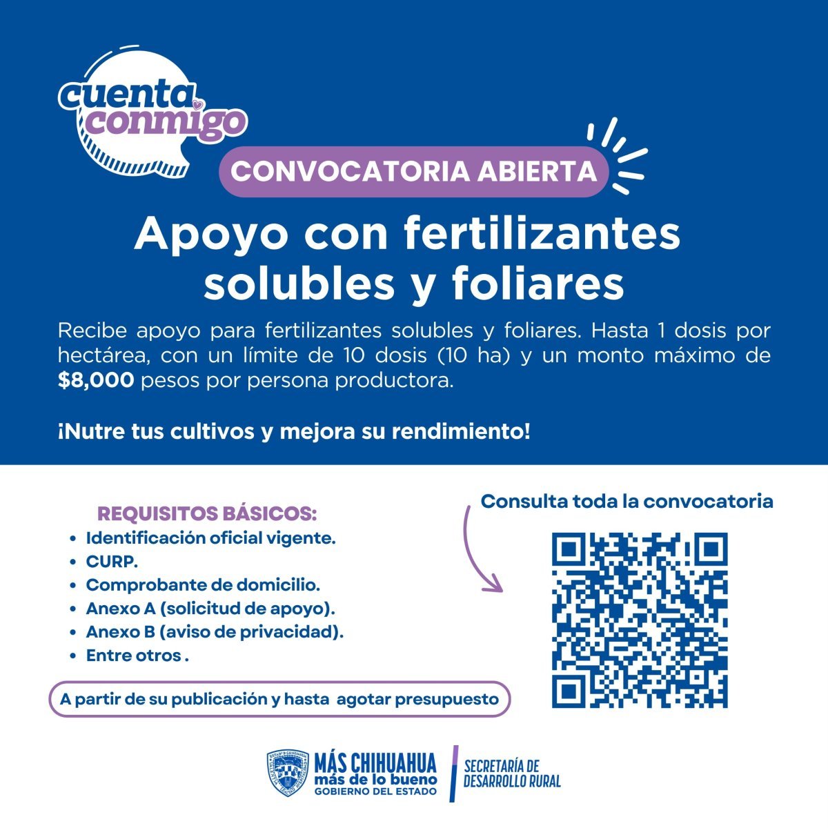 _ La Secretaría de Desarrollo Rural (SDR) del estado de Chihuahua informó que ya se encuentra disponible la convocatoria para que productores agrícolas accedan al apoyo para la adquisición de fertilizantes solubles y foliares. Este respaldo forma parte del programa 'Cuenta Conmigo en el Campo' y está dirigido a fortalecer la productividad del campo chihuahuense, facilitando el acceso a insumos que contribuyen al rendimiento de los cultivos.